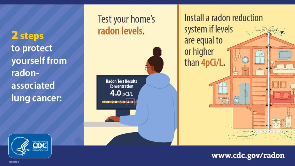 January is National Radon Action Month. Radon is a colorless, odorless radioactive gas that can cause lung cancer. It is produced by the natural decay of uranium in soil and rocks.